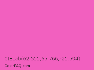 CIELab 62.511,65.766,-21.594 Color is a light magenta color and the nearest color is Hot Pink #ff69b4. Hex code #f260bf and RGB value is rgb(242,96,191). In RGB color space, this color is composed of 95% red, 38% green, 75% blue, In CMYK color space, this color is composed of 0% cyan, 60% magenta, 21% yellow , 5% black , In HSL color space, this color has a hue angle of 321° , 85% saturation and 66% lightness.