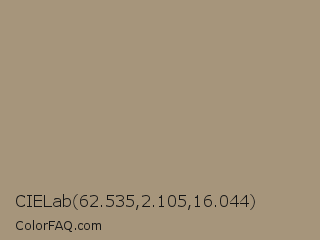 CIELab 62.535,2.105,16.044 Color is a normal orange color and the nearest color is Donkey Brown #a69279. Hex code #a6957b and RGB value is rgb(166,149,123). In RGB color space, this color is composed of 65% red, 58% green, 48% blue, In CMYK color space, this color is composed of 0% cyan, 10% magenta, 26% yellow , 35% black , In HSL color space, this color has a hue angle of 36° , 19% saturation and 57% lightness.