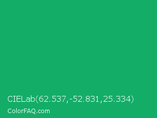 CIELab 62.537,-52.831,25.334 Color is a normal green color and the nearest color is Green Crayola #1cac78. Hex code #14ad68 and RGB value is rgb(20,173,104). In RGB color space, this color is composed of 8% red, 68% green, 41% blue, In CMYK color space, this color is composed of 88% cyan, 0% magenta, 40% yellow , 32% black , In HSL color space, this color has a hue angle of 153° , 79% saturation and 38% lightness.