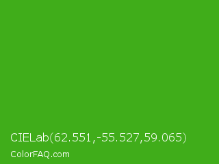 CIELab 62.551,-55.527,59.065 Color is a normal green color and the nearest color is Kelly Green #4cbb17. Hex code #40ad1a and RGB value is rgb(64,173,26). In RGB color space, this color is composed of 25% red, 68% green, 10% blue, In CMYK color space, this color is composed of 63% cyan, 0% magenta, 85% yellow , 32% black , In HSL color space, this color has a hue angle of 104° , 74% saturation and 39% lightness.