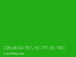 CIELab 62.557,-61.757,59.745 Color is a normal green color and the nearest color is Slimy Green #299617. Hex code #22af16 and RGB value is rgb(34,175,22). In RGB color space, this color is composed of 13% red, 69% green, 9% blue, In CMYK color space, this color is composed of 81% cyan, 0% magenta, 87% yellow , 31% black , In HSL color space, this color has a hue angle of 115° , 78% saturation and 39% lightness.