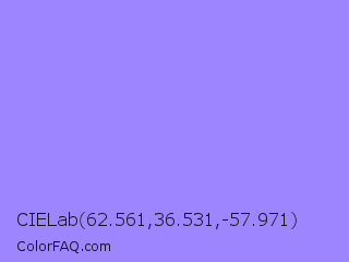 CIELab 62.561,36.531,-57.971 Color is a light indigo color and the nearest color is Dull Lavender #a899e6. Hex code #9c85ff and RGB value is rgb(156,133,255). In RGB color space, this color is composed of 61% red, 52% green, 100% blue, In CMYK color space, this color is composed of 39% cyan, 48% magenta, 0% yellow , 0% black , In HSL color space, this color has a hue angle of 251° , 100% saturation and 76% lightness.