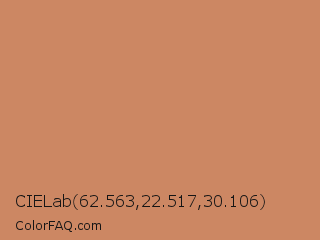 CIELab 62.563,22.517,30.106 Color is a normal orange color and the nearest color is Antique Brass #c88a65. Hex code #cc8763 and RGB value is rgb(204,135,99). In RGB color space, this color is composed of 80% red, 53% green, 39% blue, In CMYK color space, this color is composed of 0% cyan, 34% magenta, 51% yellow , 20% black , In HSL color space, this color has a hue angle of 21° , 51% saturation and 59% lightness.