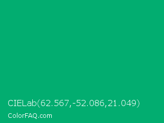 CIELab 62.567,-52.086,21.049 Color is a normal green color and the nearest color is Jade #00a86b. Hex code #02ad70 and RGB value is rgb(2,173,112). In RGB color space, this color is composed of 1% red, 68% green, 44% blue, In CMYK color space, this color is composed of 99% cyan, 0% magenta, 35% yellow , 32% black , In HSL color space, this color has a hue angle of 159° , 98% saturation and 34% lightness.