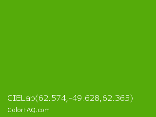 CIELab 62.574,-49.628,62.365 Color is a normal green color and the nearest color is Christi #67a712. Hex code #55ab0a and RGB value is rgb(85,171,10). In RGB color space, this color is composed of 33% red, 67% green, 4% blue, In CMYK color space, this color is composed of 50% cyan, 0% magenta, 94% yellow , 33% black , In HSL color space, this color has a hue angle of 92° , 89% saturation and 35% lightness.