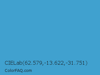 CIELab 62.579,-13.622,-31.751 Color is a normal blue color and the nearest color is Maximum Blue #47abcc. Hex code #40a1cf and RGB value is rgb(64,161,207). In RGB color space, this color is composed of 25% red, 63% green, 81% blue, In CMYK color space, this color is composed of 69% cyan, 22% magenta, 0% yellow , 19% black , In HSL color space, this color has a hue angle of 199° , 60% saturation and 53% lightness.