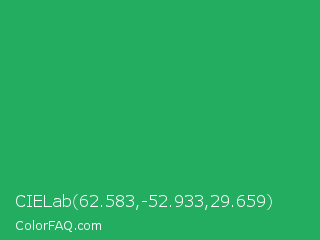 CIELab 62.583,-52.933,29.659 Color is a normal green color and the nearest color is Green Crayola #1cac78. Hex code #23ad60 and RGB value is rgb(35,173,96). In RGB color space, this color is composed of 14% red, 68% green, 38% blue, In CMYK color space, this color is composed of 80% cyan, 0% magenta, 45% yellow , 32% black , In HSL color space, this color has a hue angle of 147° , 66% saturation and 41% lightness.