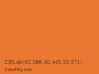 CIELab 62.588,40.445,55.571 Color is a normal orange color and the nearest color is Vivid Tangelo #f07427. Hex code #eb7733 and RGB value is rgb(235,119,51). In RGB color space, this color is composed of 92% red, 47% green, 20% blue, In CMYK color space, this color is composed of 0% cyan, 49% magenta, 78% yellow , 8% black , In HSL color space, this color has a hue angle of 22° , 82% saturation and 56% lightness.