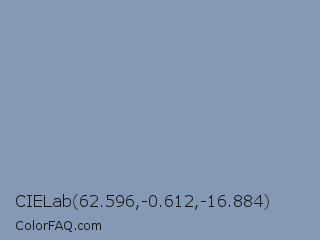CIELab 62.596,-0.612,-16.884 Color is a light blue color and the nearest color is Bali Hai #859faf. Hex code #8599b5 and RGB value is rgb(133,153,181). In RGB color space, this color is composed of 52% red, 60% green, 71% blue, In CMYK color space, this color is composed of 27% cyan, 15% magenta, 0% yellow , 29% black , In HSL color space, this color has a hue angle of 215° , 24% saturation and 62% lightness.