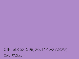 CIELab 62.598,26.114,-27.829 Color is a light purple color and the nearest color is East Side #ac91ce. Hex code #ae89c9 and RGB value is rgb(174,137,201). In RGB color space, this color is composed of 68% red, 54% green, 79% blue, In CMYK color space, this color is composed of 13% cyan, 32% magenta, 0% yellow , 21% black , In HSL color space, this color has a hue angle of 275° , 37% saturation and 66% lightness.