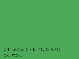 CIELab 62.5,-45.41,33.904 Color is a normal green color and the nearest color is Fruit Salad #4f9d5d. Hex code #4caa58 and RGB value is rgb(76,170,88). In RGB color space, this color is composed of 30% red, 67% green, 35% blue, In CMYK color space, this color is composed of 55% cyan, 0% magenta, 48% yellow , 33% black , In HSL color space, this color has a hue angle of 128° , 38% saturation and 48% lightness.