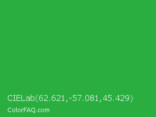 CIELab 62.621,-57.081,45.429 Color is a normal green color and the nearest color is Wageningen Green #34b233. Hex code #2aae40 and RGB value is rgb(42,174,64). In RGB color space, this color is composed of 16% red, 68% green, 25% blue, In CMYK color space, this color is composed of 76% cyan, 0% magenta, 63% yellow , 32% black , In HSL color space, this color has a hue angle of 130° , 61% saturation and 42% lightness.