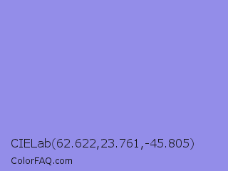 CIELab 62.622,23.761,-45.805 Color is a light indigo color and the nearest color is Portage #8b9fee. Hex code #938de9 and RGB value is rgb(147,141,233). In RGB color space, this color is composed of 58% red, 55% green, 91% blue, In CMYK color space, this color is composed of 37% cyan, 39% magenta, 0% yellow , 9% black , In HSL color space, this color has a hue angle of 244° , 68% saturation and 73% lightness.