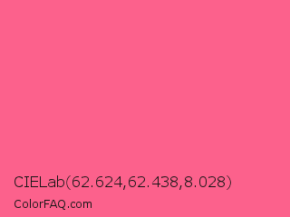 CIELab 62.624,62.438,8.028 Color is a light rose color and the nearest color is Strawberry #fc5a8d. Hex code #fc618c and RGB value is rgb(252,97,140). In RGB color space, this color is composed of 99% red, 38% green, 55% blue, In CMYK color space, this color is composed of 0% cyan, 62% magenta, 44% yellow , 1% black , In HSL color space, this color has a hue angle of 343° , 96% saturation and 68% lightness.