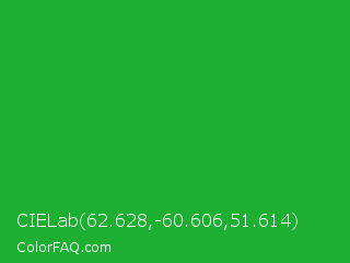 CIELab 62.628,-60.606,51.614 Color is a normal green color and the nearest color is Wageningen Green #34b233. Hex code #1daf31 and RGB value is rgb(29,175,49). In RGB color space, this color is composed of 11% red, 69% green, 19% blue, In CMYK color space, this color is composed of 83% cyan, 0% magenta, 72% yellow , 31% black , In HSL color space, this color has a hue angle of 128° , 72% saturation and 40% lightness.