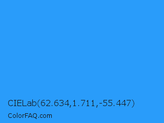CIELab 62.634,1.711,-55.447 Color is a normal blue color and the nearest color is Brilliant Azure #3399ff. Hex code #299cfa and RGB value is rgb(41,156,250). In RGB color space, this color is composed of 16% red, 61% green, 98% blue, In CMYK color space, this color is composed of 84% cyan, 38% magenta, 0% yellow , 2% black , In HSL color space, this color has a hue angle of 207° , 95% saturation and 57% lightness.