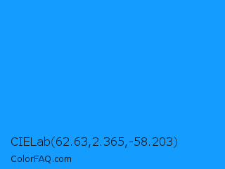 CIELab 62.63,2.365,-58.203 Color is a normal blue color and the nearest color is Dodger Blue #1e90ff. Hex code #149cff and RGB value is rgb(20,156,255). In RGB color space, this color is composed of 8% red, 61% green, 100% blue, In CMYK color space, this color is composed of 92% cyan, 39% magenta, 0% yellow , 0% black , In HSL color space, this color has a hue angle of 205° , 100% saturation and 54% lightness.