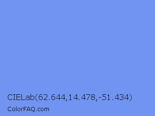CIELab 62.644,14.478,-51.434 Color is a light blue color and the nearest color is Cornflower Blue #6495ed. Hex code #7194f3 and RGB value is rgb(113,148,243). In RGB color space, this color is composed of 44% red, 58% green, 95% blue, In CMYK color space, this color is composed of 53% cyan, 39% magenta, 0% yellow , 5% black , In HSL color space, this color has a hue angle of 224° , 84% saturation and 70% lightness.