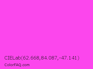 CIELab 62.668,84.087,-47.141 Color is a light magenta color and the nearest color is Purple Pizzazz #fe4eda. Hex code #fc46ed and RGB value is rgb(252,70,237). In RGB color space, this color is composed of 99% red, 27% green, 93% blue, In CMYK color space, this color is composed of 0% cyan, 72% magenta, 6% yellow , 1% black , In HSL color space, this color has a hue angle of 305° , 97% saturation and 63% lightness.