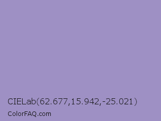 CIELab 62.677,15.942,-25.021 Color is a light indigo color and the nearest color is Blue Bell Crayola #9999cc. Hex code #9e90c4 and RGB value is rgb(158,144,196). In RGB color space, this color is composed of 62% red, 56% green, 77% blue, In CMYK color space, this color is composed of 19% cyan, 27% magenta, 0% yellow , 23% black , In HSL color space, this color has a hue angle of 256° , 31% saturation and 67% lightness.