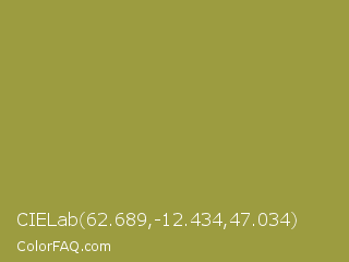 CIELab 62.689,-12.434,47.034 Color is a normal yellow color and the nearest color is Sycamore #908d39. Hex code #9c9c40 and RGB value is rgb(156,156,64). In RGB color space, this color is composed of 61% red, 61% green, 25% blue, In CMYK color space, this color is composed of 0% cyan, 0% magenta, 59% yellow , 39% black , In HSL color space, this color has a hue angle of 60° , 42% saturation and 43% lightness.