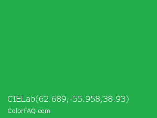 CIELab 62.689,-55.958,38.93 Color is a normal green color and the nearest color is Wageningen Green #34b233. Hex code #25ae4e and RGB value is rgb(37,174,78). In RGB color space, this color is composed of 15% red, 68% green, 31% blue, In CMYK color space, this color is composed of 79% cyan, 0% magenta, 55% yellow , 32% black , In HSL color space, this color has a hue angle of 138° , 65% saturation and 41% lightness.