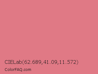 CIELab 62.689,41.09,11.572 Color is a light red color and the nearest color is Candy Pink #e4717a. Hex code #e07985 and RGB value is rgb(224,121,133). In RGB color space, this color is composed of 88% red, 47% green, 52% blue, In CMYK color space, this color is composed of 0% cyan, 46% magenta, 41% yellow , 12% black , In HSL color space, this color has a hue angle of 353° , 62% saturation and 68% lightness.