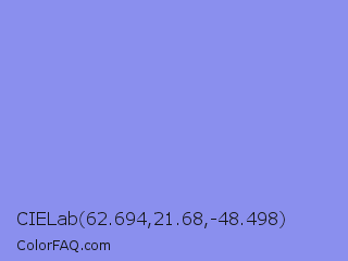 CIELab 62.694,21.68,-48.498 Color is a light blue color and the nearest color is Portage #8b9fee. Hex code #8a8fee and RGB value is rgb(138,143,238). In RGB color space, this color is composed of 54% red, 56% green, 93% blue, In CMYK color space, this color is composed of 42% cyan, 40% magenta, 0% yellow , 7% black , In HSL color space, this color has a hue angle of 237° , 75% saturation and 74% lightness.