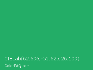 CIELab 62.696,-51.625,26.109 Color is a normal green color and the nearest color is Green Crayola #1cac78. Hex code #23ad67 and RGB value is rgb(35,173,103). In RGB color space, this color is composed of 14% red, 68% green, 40% blue, In CMYK color space, this color is composed of 80% cyan, 0% magenta, 40% yellow , 32% black , In HSL color space, this color has a hue angle of 150° , 66% saturation and 41% lightness.