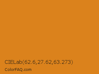 CIELab 62.6,27.62,63.273 Color is a normal orange color and the nearest color is Zest #e5841b. Hex code #db821c and RGB value is rgb(219,130,28). In RGB color space, this color is composed of 86% red, 51% green, 11% blue, In CMYK color space, this color is composed of 0% cyan, 41% magenta, 87% yellow , 14% black , In HSL color space, this color has a hue angle of 32° , 77% saturation and 48% lightness.