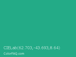 CIELab 62.703,-43.693,8.64 Color is a normal cyan color and the nearest color is Jungle Green #29ab87. Hex code #23ab87 and RGB value is rgb(35,171,135). In RGB color space, this color is composed of 14% red, 67% green, 53% blue, In CMYK color space, this color is composed of 80% cyan, 0% magenta, 21% yellow , 33% black , In HSL color space, this color has a hue angle of 164° , 66% saturation and 40% lightness.