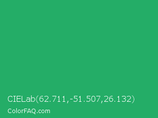 CIELab 62.711,-51.507,26.132 Color is a normal green color and the nearest color is Green Crayola #1cac78. Hex code #24ad67 and RGB value is rgb(36,173,103). In RGB color space, this color is composed of 14% red, 68% green, 40% blue, In CMYK color space, this color is composed of 79% cyan, 0% magenta, 40% yellow , 32% black , In HSL color space, this color has a hue angle of 149° , 66% saturation and 41% lightness.