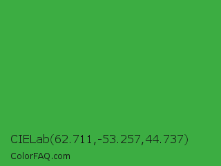 CIELab 62.711,-53.257,44.737 Color is a normal green color and the nearest color is Wageningen Green #34b233. Hex code #3cad42 and RGB value is rgb(60,173,66). In RGB color space, this color is composed of 24% red, 68% green, 26% blue, In CMYK color space, this color is composed of 65% cyan, 0% magenta, 62% yellow , 32% black , In HSL color space, this color has a hue angle of 123° , 48% saturation and 46% lightness.