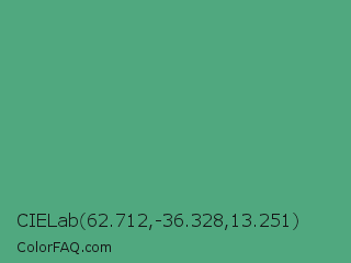 CIELab 62.712,-36.328,13.251 Color is a normal green color and the nearest color is Shiny Shamrock #5fa778. Hex code #50a87f and RGB value is rgb(80,168,127). In RGB color space, this color is composed of 31% red, 66% green, 50% blue, In CMYK color space, this color is composed of 52% cyan, 0% magenta, 24% yellow , 34% black , In HSL color space, this color has a hue angle of 152° , 35% saturation and 49% lightness.