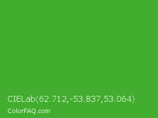 CIELab 62.712,-53.837,53.064 Color is a normal green color and the nearest color is Wageningen Green #34b233. Hex code #42ad2e and RGB value is rgb(66,173,46). In RGB color space, this color is composed of 26% red, 68% green, 18% blue, In CMYK color space, this color is composed of 62% cyan, 0% magenta, 73% yellow , 32% black , In HSL color space, this color has a hue angle of 111° , 58% saturation and 43% lightness.