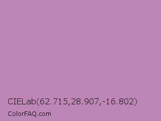 CIELab 62.715,28.907,-16.802 Color is a light magenta color and the nearest color is African Violet #b284be. Hex code #bd86b6 and RGB value is rgb(189,134,182). In RGB color space, this color is composed of 74% red, 53% green, 71% blue, In CMYK color space, this color is composed of 0% cyan, 29% magenta, 4% yellow , 26% black , In HSL color space, this color has a hue angle of 308° , 29% saturation and 63% lightness.