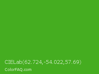 CIELab 62.724,-54.022,57.69 Color is a normal green color and the nearest color is Kelly Green #4cbb17. Hex code #45ad20 and RGB value is rgb(69,173,32). In RGB color space, this color is composed of 27% red, 68% green, 13% blue, In CMYK color space, this color is composed of 60% cyan, 0% magenta, 82% yellow , 32% black , In HSL color space, this color has a hue angle of 104° , 69% saturation and 40% lightness.