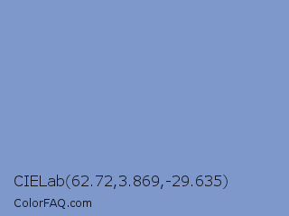 CIELab 62.72,3.869,-29.635 Color is a light blue color and the nearest color is Dark Pastel Blue #779ecb. Hex code #7e98cc and RGB value is rgb(126,152,204). In RGB color space, this color is composed of 49% red, 60% green, 80% blue, In CMYK color space, this color is composed of 38% cyan, 25% magenta, 0% yellow , 20% black , In HSL color space, this color has a hue angle of 220° , 43% saturation and 65% lightness.