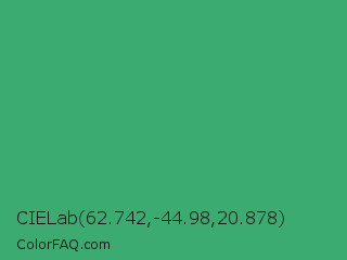 CIELab 62.742,-44.98,20.878 Color is a normal green color and the nearest color is Medium Sea Green #3cb371. Hex code #3cab71 and RGB value is rgb(60,171,113). In RGB color space, this color is composed of 24% red, 67% green, 44% blue, In CMYK color space, this color is composed of 65% cyan, 0% magenta, 34% yellow , 33% black , In HSL color space, this color has a hue angle of 149° , 48% saturation and 45% lightness.