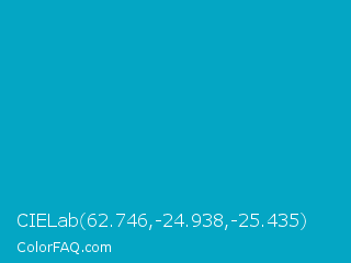 CIELab 62.746,-24.938,-25.435 Color is a normal cyan color and the nearest color is Pacific Blue Crayola #009dc4. Hex code #04a6c4 and RGB value is rgb(4,166,196). In RGB color space, this color is composed of 2% red, 65% green, 77% blue, In CMYK color space, this color is composed of 98% cyan, 15% magenta, 0% yellow , 23% black , In HSL color space, this color has a hue angle of 189° , 96% saturation and 39% lightness.
