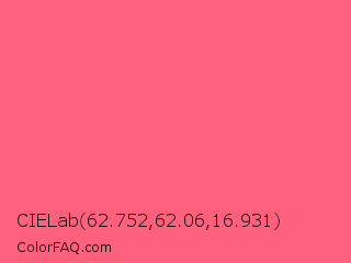 CIELab 62.752,62.06,16.931 Color is a light red color and the nearest color is Brink Pink #fb607f. Hex code #ff617d and RGB value is rgb(255,97,125). In RGB color space, this color is composed of 100% red, 38% green, 49% blue, In CMYK color space, this color is composed of 0% cyan, 62% magenta, 51% yellow , 0% black , In HSL color space, this color has a hue angle of 349° , 100% saturation and 69% lightness.
