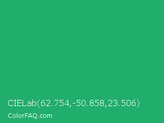 CIELab 62.754,-50.858,23.506 Color is a normal green color and the nearest color is Green Crayola #1cac78. Hex code #21ad6c and RGB value is rgb(33,173,108). In RGB color space, this color is composed of 13% red, 68% green, 42% blue, In CMYK color space, this color is composed of 81% cyan, 0% magenta, 38% yellow , 32% black , In HSL color space, this color has a hue angle of 152° , 68% saturation and 40% lightness.