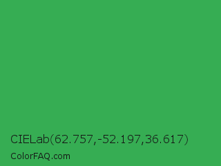 CIELab 62.757,-52.197,36.617 Color is a normal green color and the nearest color is Chateau Green #40a860. Hex code #36ad53 and RGB value is rgb(54,173,83). In RGB color space, this color is composed of 21% red, 68% green, 33% blue, In CMYK color space, this color is composed of 69% cyan, 0% magenta, 52% yellow , 32% black , In HSL color space, this color has a hue angle of 135° , 52% saturation and 45% lightness.