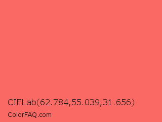 CIELab 62.784,55.039,31.656 Color is a light red color and the nearest color is Pastel Red #ff6961. Hex code #fa6963 and RGB value is rgb(250,105,99). In RGB color space, this color is composed of 98% red, 41% green, 39% blue, In CMYK color space, this color is composed of 0% cyan, 58% magenta, 60% yellow , 2% black , In HSL color space, this color has a hue angle of 2° , 94% saturation and 68% lightness.