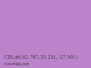 CIELab 62.787,33.231,-27.991 Color is a light purple color and the nearest color is African Violet #b284be. Hex code #bb84ca and RGB value is rgb(187,132,202). In RGB color space, this color is composed of 73% red, 52% green, 79% blue, In CMYK color space, this color is composed of 7% cyan, 35% magenta, 0% yellow , 21% black , In HSL color space, this color has a hue angle of 287° , 40% saturation and 65% lightness.
