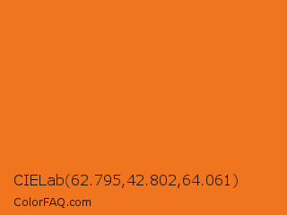 CIELab 62.795,42.802,64.061 Color is a normal orange color and the nearest color is Tango #ed7a1c. Hex code #f0751e and RGB value is rgb(240,117,30). In RGB color space, this color is composed of 94% red, 46% green, 12% blue, In CMYK color space, this color is composed of 0% cyan, 51% magenta, 88% yellow , 6% black , In HSL color space, this color has a hue angle of 25° , 88% saturation and 53% lightness.