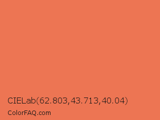 CIELab 62.803,43.713,40.04 Color is a light red color and the nearest color is Burnt Sienna #e97451. Hex code #ed7553 and RGB value is rgb(237,117,83). In RGB color space, this color is composed of 93% red, 46% green, 33% blue, In CMYK color space, this color is composed of 0% cyan, 51% magenta, 65% yellow , 7% black , In HSL color space, this color has a hue angle of 13° , 81% saturation and 63% lightness.