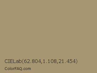 CIELab 62.804,1.108,21.454 Color is a normal orange color and the nearest color is Donkey Brown #a69279. Hex code #a89672 and RGB value is rgb(168,150,114). In RGB color space, this color is composed of 66% red, 59% green, 45% blue, In CMYK color space, this color is composed of 0% cyan, 11% magenta, 32% yellow , 34% black , In HSL color space, this color has a hue angle of 40° , 24% saturation and 55% lightness.