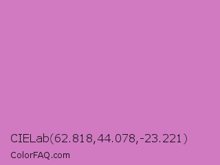 CIELab 62.818,44.078,-23.221 Color is a light magenta color and the nearest color is Middle Purple #d982b5. Hex code #d17ac2 and RGB value is rgb(209,122,194). In RGB color space, this color is composed of 82% red, 48% green, 76% blue, In CMYK color space, this color is composed of 0% cyan, 42% magenta, 7% yellow , 18% black , In HSL color space, this color has a hue angle of 310° , 49% saturation and 65% lightness.