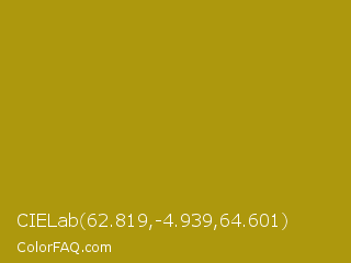 CIELab 62.819,-4.939,64.601 Color is a normal yellow color and the nearest color is Sahara #b7a214. Hex code #ad980d and RGB value is rgb(173,152,13). In RGB color space, this color is composed of 68% red, 60% green, 5% blue, In CMYK color space, this color is composed of 0% cyan, 12% magenta, 92% yellow , 32% black , In HSL color space, this color has a hue angle of 52° , 86% saturation and 36% lightness.